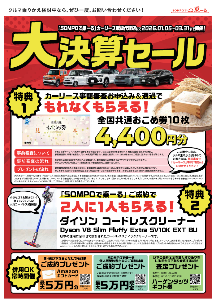 「SOMPOで乗ーる」大決算セールのご案内です。 カーリース事前審査お申込み&通過でおこめ券がもらえます! 条件を満たしたお車の査定だけでもハーゲンダッツギフト券もプレゼント! 車検前、お乗り換えをご検討の際は、ぜひこの機会に査定だけでもご利用ください。