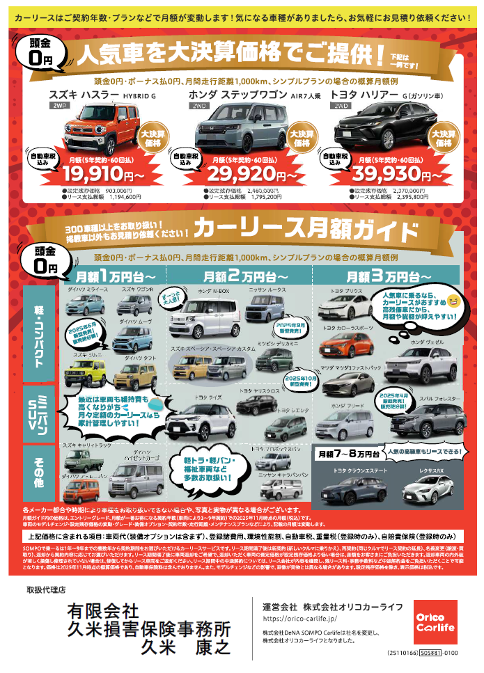 HOME > 未分類 > 未分類 「SOMPOで乗ーる」大決算セール 2026.0105~03.31 2025年12月22日 「SOMPOで乗ーる」大決算セールのご案内です。 カーリース事前審査お申込み&通過でおこめ券がもらえます! 条件を満たしたお車の査定だけでもハーゲンダッツギフト券もプレゼント! 車検前、お乗り換えをご検討の際は、ぜひこの機会に査定だけでもご利用ください。 Twitter Share Pocket Hatena LINE URLコピー -未分類
